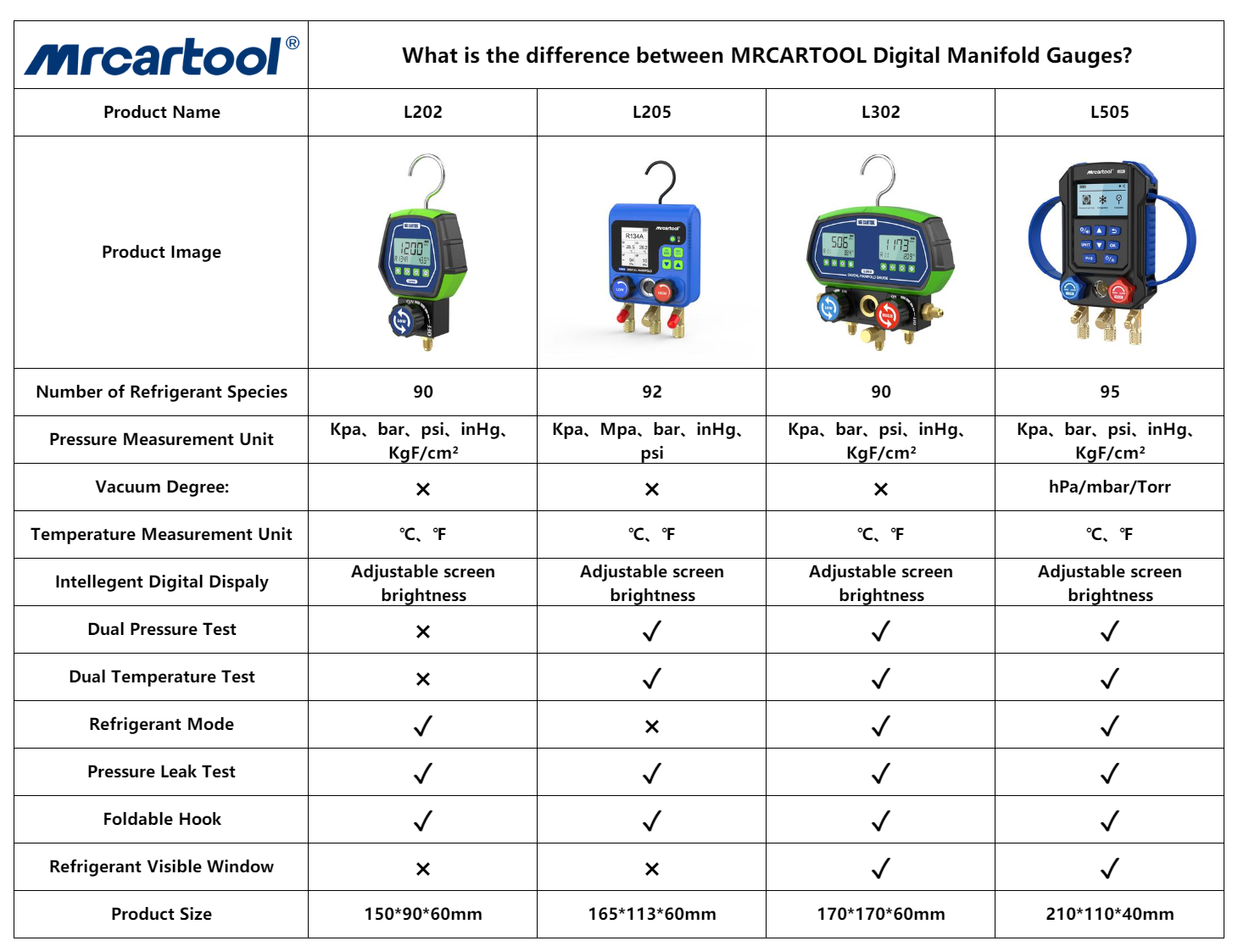 MRCARTOOL L202 Medidores de refrigerante y medidores de aire acondicionado