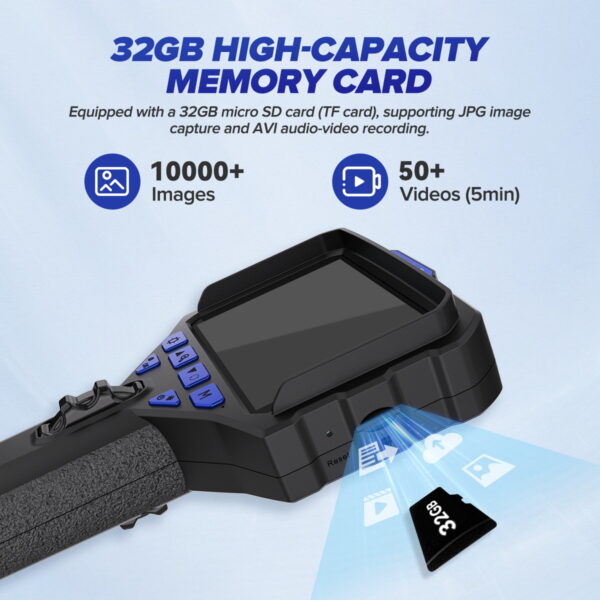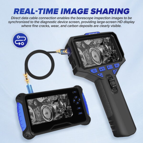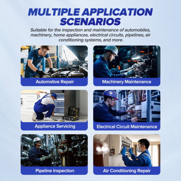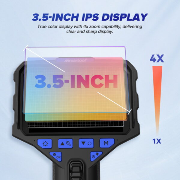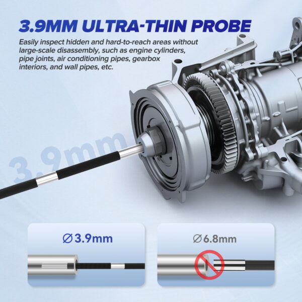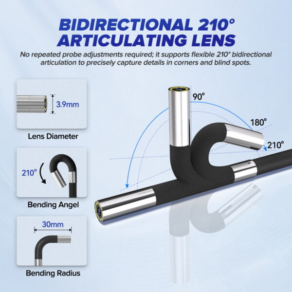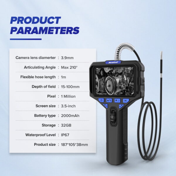 The MRCARTOOL N220 digital inspection camera is a professional IP67-rated car endoscope featuring a 3.9mm flexible probe with up to 210-degree articulation. This adjustable high-definition video endoscope It serves as a flexible engine borescope for inspecting hard-to-reach areas in vehicles. Its large 3.5-inch screen provides a clear view and supports external monitors. It also records video or photos for real-time feedback to customers, making it the top choice for auto repair shops and plumbing service providers.