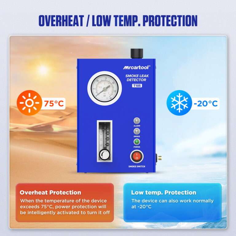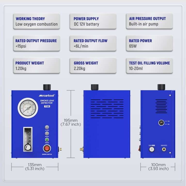 MRCARTOOL T105 Smoke For Leak Detection es una máquina profesional de humo para automóviles que proporciona una detección exhaustiva de fugas en todas las partes de las tuberías del coche. Es fácil de manejar y portátil y produce humo rápidamente. Es una herramienta excelente para encontrar y reparar tuberías como las de admisión, escape y fugas de emisiones de su coche. Comprobar con regularidad el estado de las fugas de las tuberías favorece el mantenimiento de su coche, lo hace más saludable y garantiza su seguridad al volante.