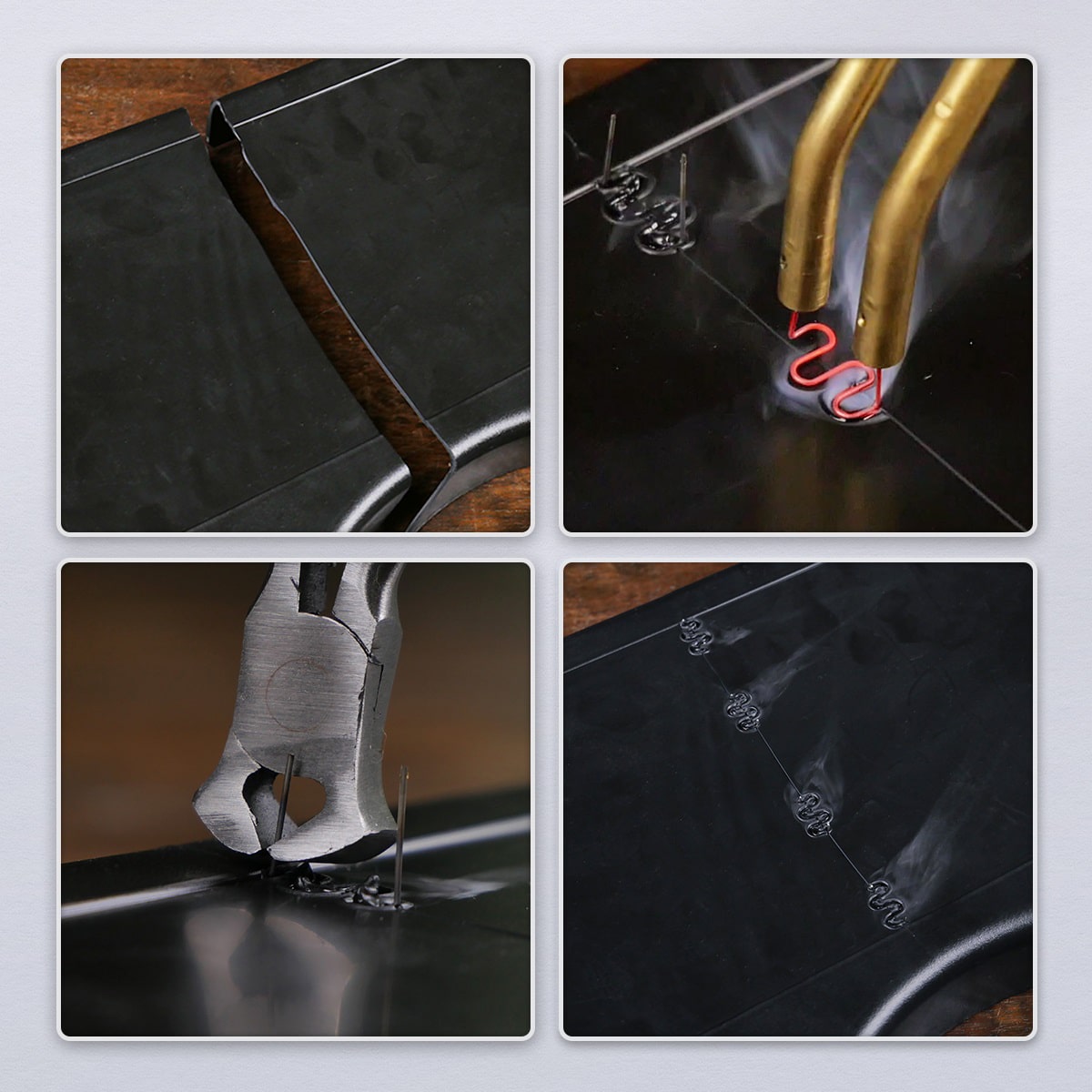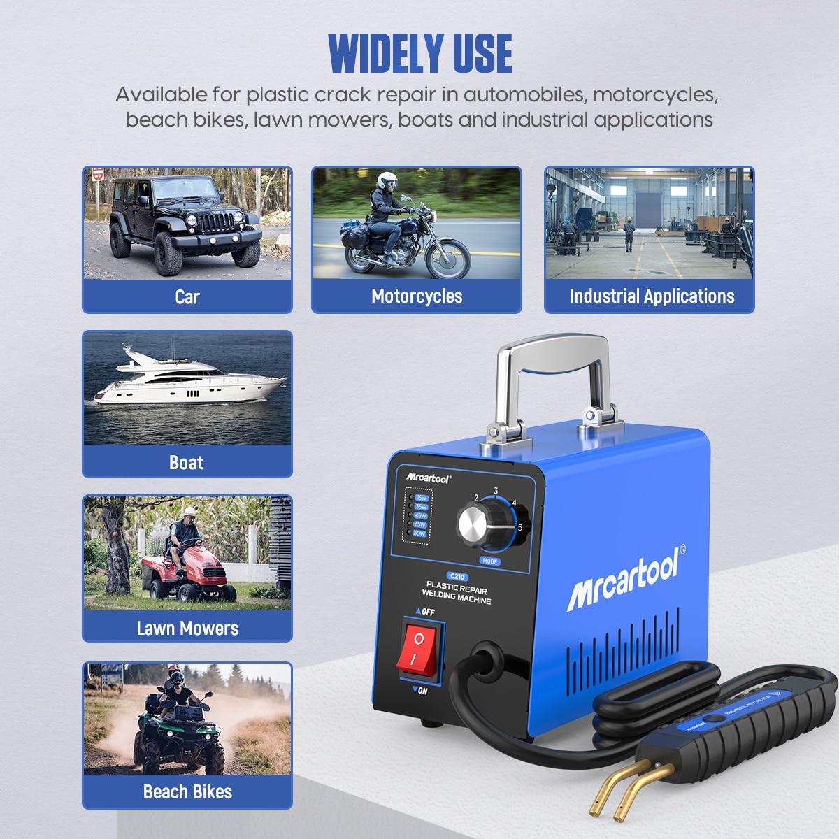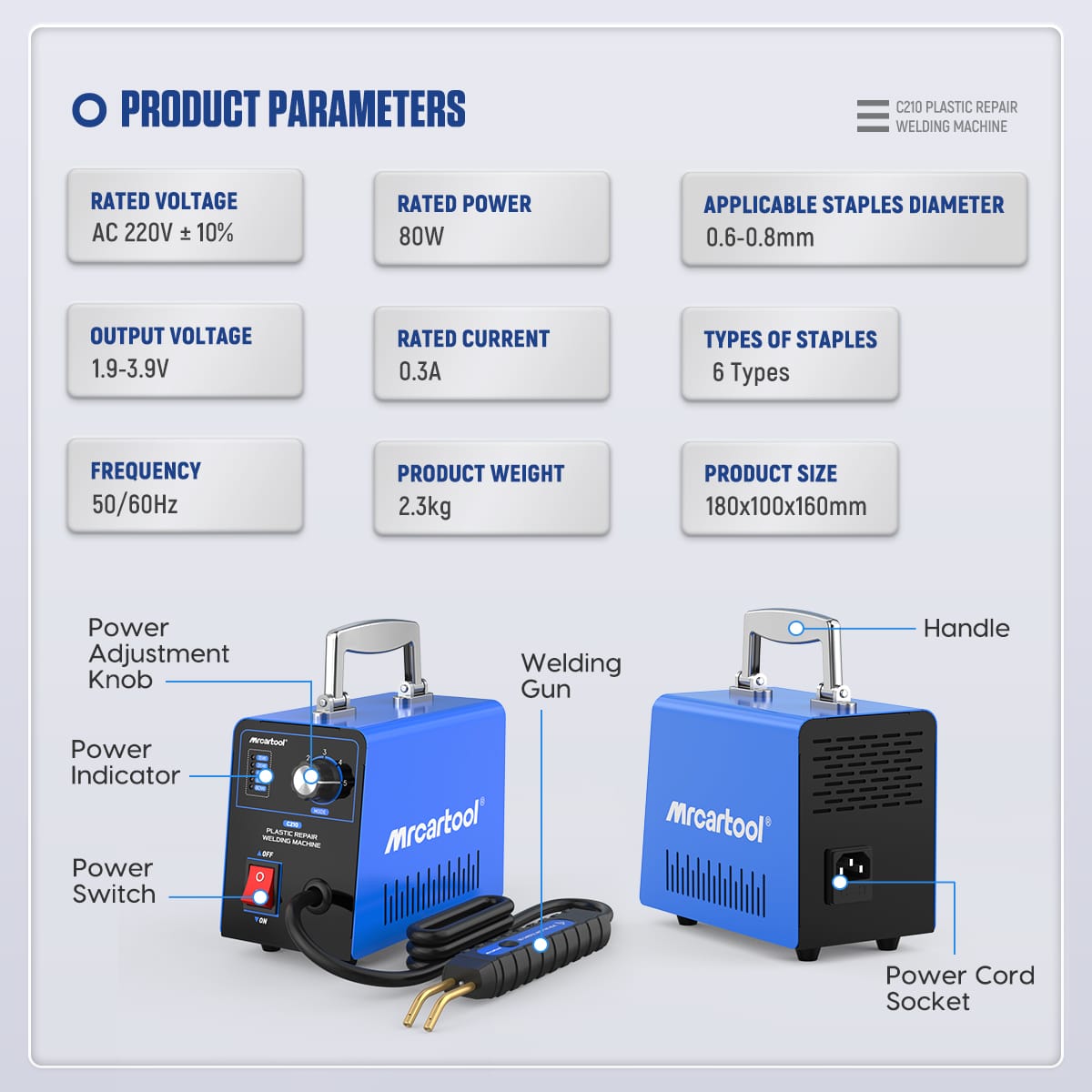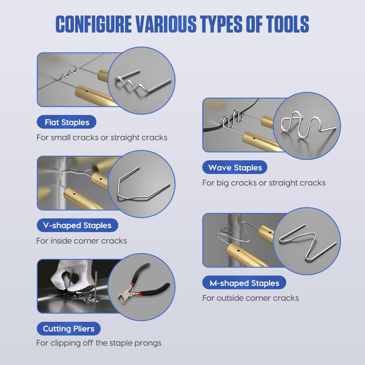 MRCARTOOL C210 Automotive Bumper Repair Kit includes 600 hot melt welding studs in various specifications, such as flat-head, wave-head, outer-corner, and inner-corner types, to meet diverse welding requirements. This kit enables rapid repair of damaged plastic components with a perfect fit. The C210 Plastic Bumper Welder is suitable for repairing plastic parts in household tools, automobiles, motorcycles, ATVs, boats, and more.