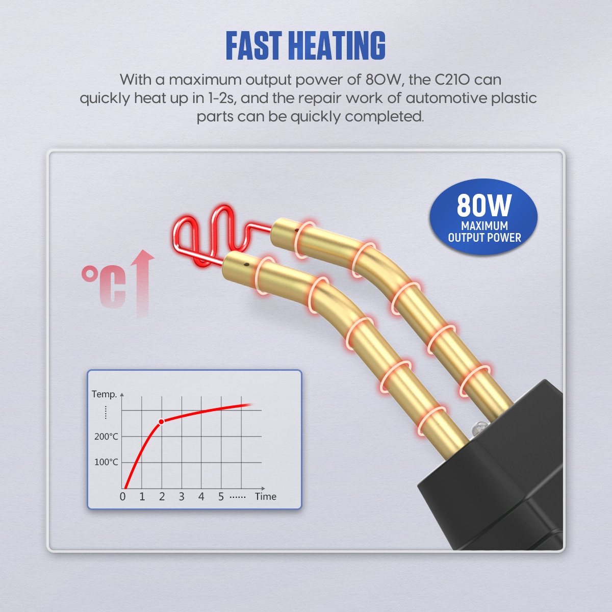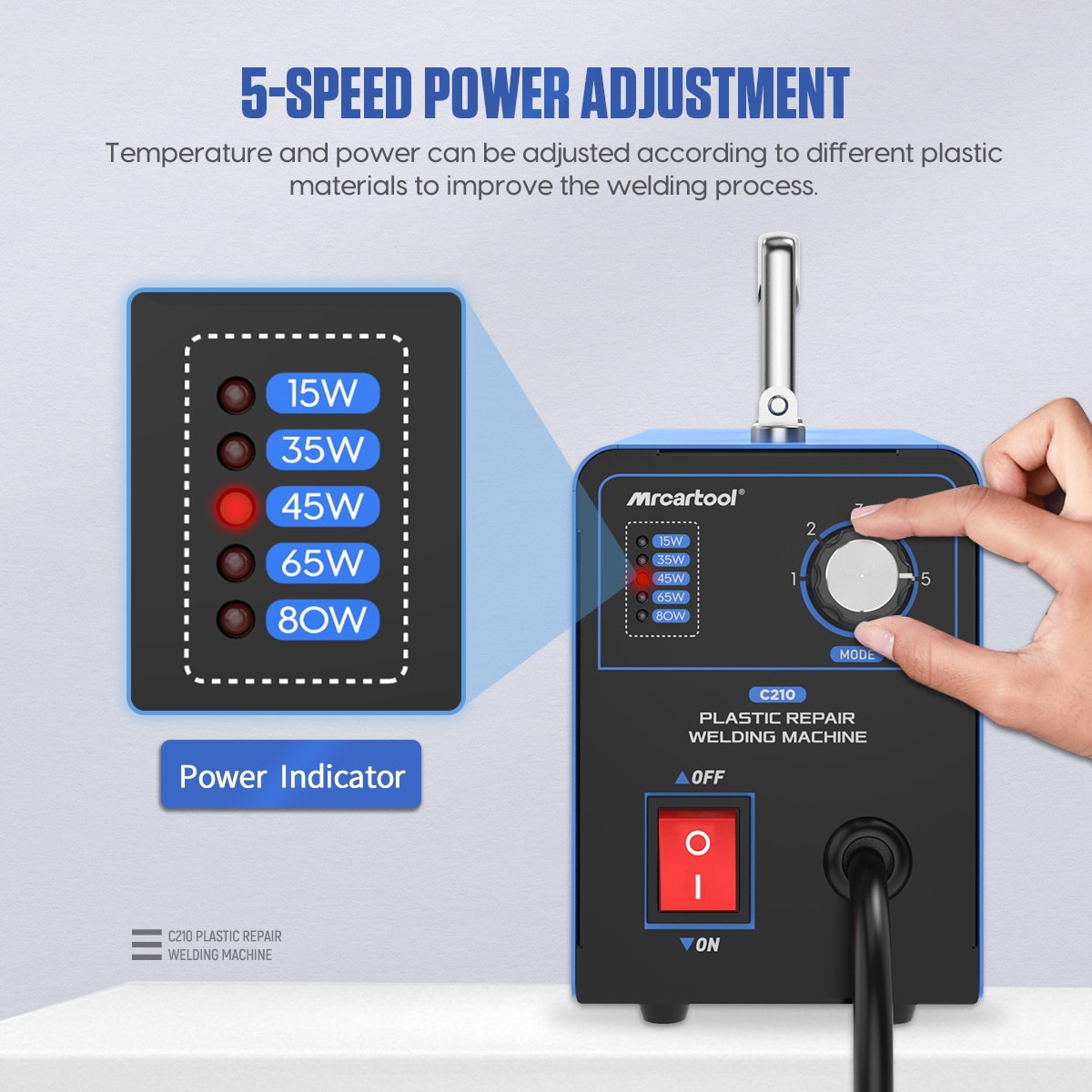 - Five-Level Power Adjustment: This Car Bumper Repair Kit features five power settings: 15W/35W/45W/65W/80W. Its lowest setting at 25W heats faster than standard 100W handheld hot melt guns. The maximum 80W setting achieves rapid heating in 1-2 seconds, enabling swift repairs on automotive plastic components.