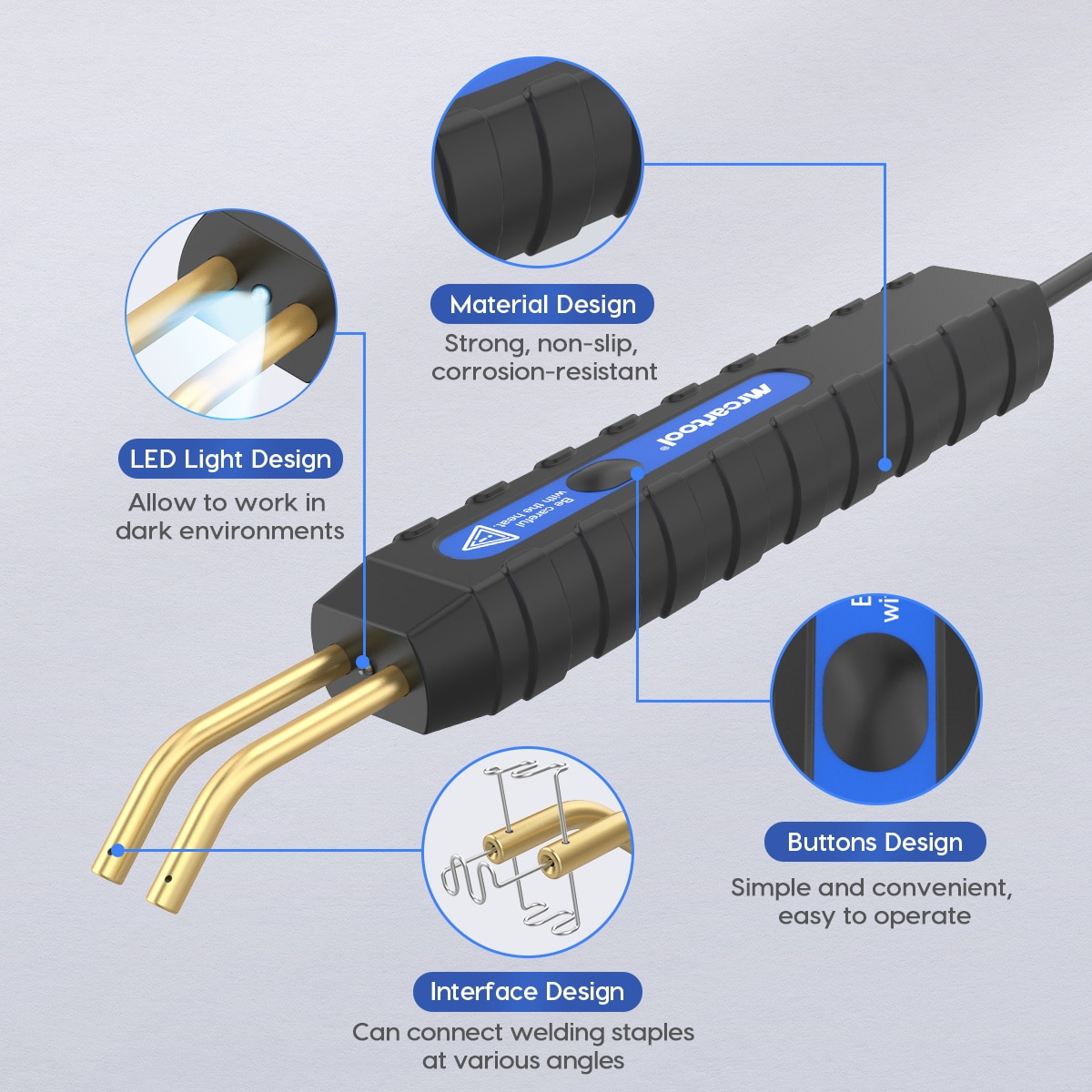 - LED Worklight: Integrated LED illumination brightens the work area for safe, smooth operation. The handle is crafted from durable, non-slip, corrosion-resistant material that fits comfortably in the palm. Light-touch button controls ensure easy operation. The interface accommodates welding pins at various angles to meet diverse repair needs.