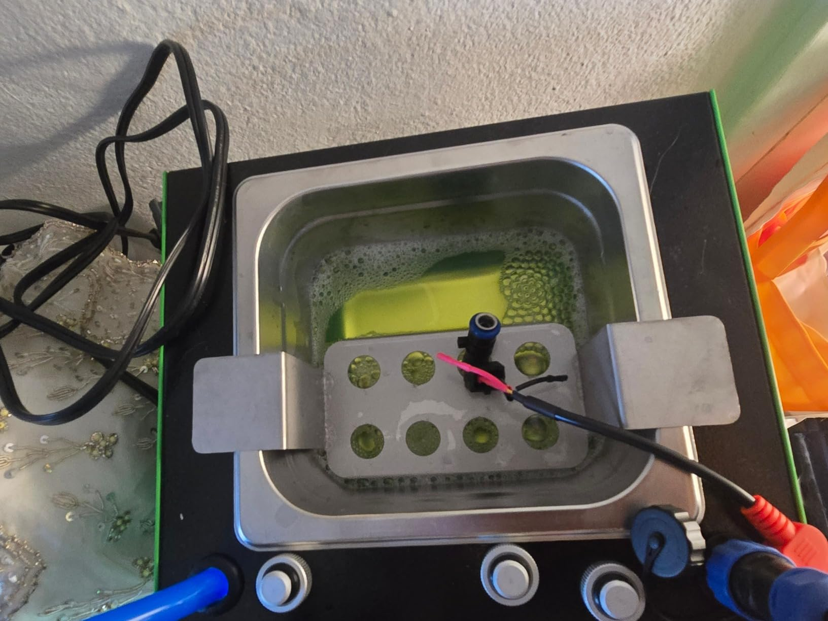 - Turn on the ultrasonic system to allow the ultrasonic energy to dislodge any particle buildup inside the injectors. After cleaning, recycle the remaining cleaning fluid.